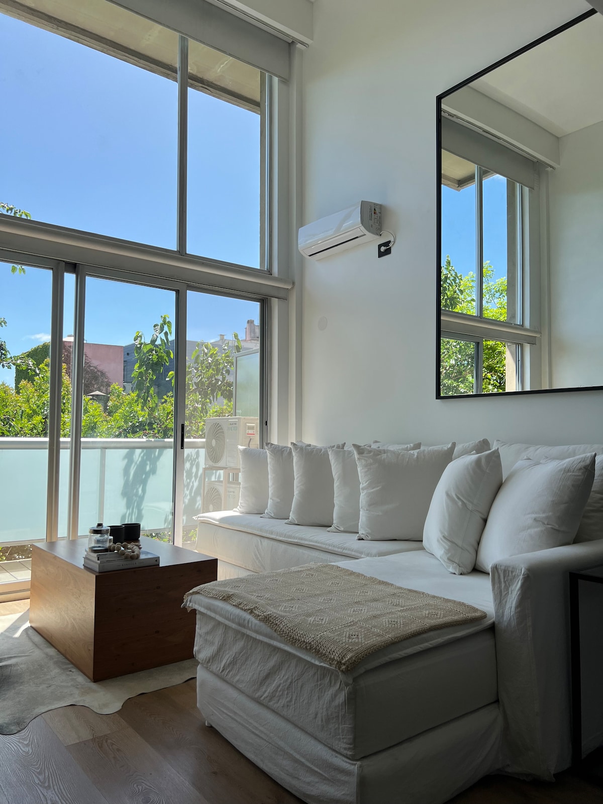Amazing LOFT located in the heart of Palermo Hollywood. The building, "Los Silos de Dorrego",is a refurbished ex grain factory from 1920, surrounded with a huge garden full of ancient trees. The complex has this green space to enjoy, with a large (heated) swimming-pool. Also has a gym, dry sauna and a restaurant & bar only for residents. The loft is super unique and stylish. With a cool taste in every detail. double high and tall walls with huge windows, both with views to the pool and garden.