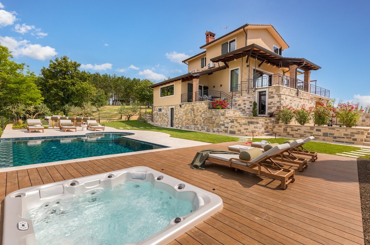 令人驚嘆的設計師別墅Ulmus位於伊斯特里亞,坐落在風景如畫的莫托文鎮的安靜環境中。 Ulmus別墅位於1.100平方公尺的物業上,綠意盎然,四周環繞著大自然和葡萄園。別墅周圍沒有人流和交通。 美麗的花園內有按摩浴缸、燒烤、餐桌和36平方公尺的溫水泳池。戶外區域有一個兒童角落,包括彈跳床和遊戲屋。
