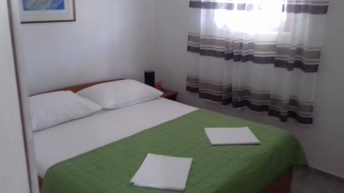 公寓位於一棟家庭住宅的一樓。 配備兩間臥室,每個房間都有一張雙人牀。 公寓旁邊有廚房、客廳、浴室和俯瞰大海的露臺。 公寓配備空調、WiFi。