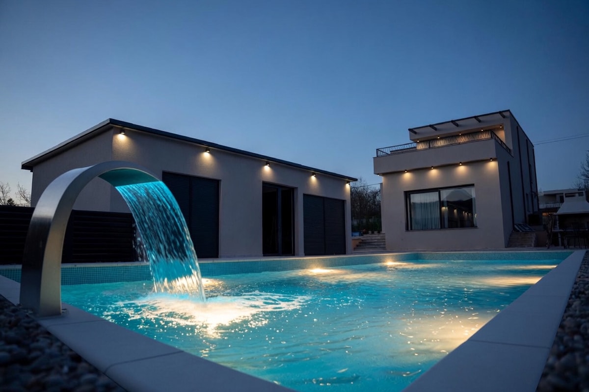 Ovaj moderni smještaj savršen je odabir za one koji putuju u grupama. Smještaj je idealan za obitelji s djecom koja mogu uživati u raznim aktivnostima poput trampolina, ljuljački i tobogana. Uz sve navedeno, prisutan je i vanjski bazen iznimno velikih dimenzija u kojem istovremeno mogu uživati svi gosti u kuci.