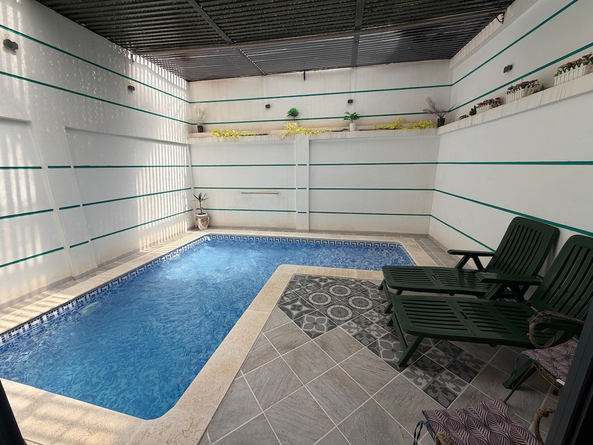 入住兼具舒適、優雅和精緻的高級別墅: 泳池5x4米(1.50米深) , 讓你放鬆的傳統土耳其浴 三間寬敞的空調房間,配有更衣室 為整個地面安裝大型冷氣。 現代化廚房通向露台,設有6人大桌、電動捲簾和燒烤設施。 兩間配有義大利淋浴間的浴室。 在出口時,你將被要求支付5000第納爾的清潔費
