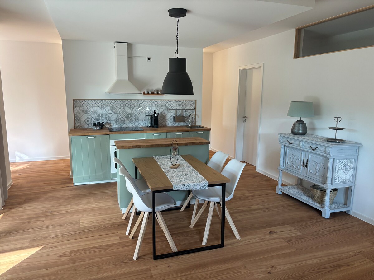 在我們特別安靜的房源放鬆身心! 新裝修的公寓,最多可容納4人,面積約60平方米,分布在兩層樓上。 值得一提的是設備齊全的廚房、電視、沙發牀、大型全景窗戶、舒適的彈簧牀、配有室外座位的私人露臺和足夠的客戶停車位。 度假住宿的全景窗戶面向日出和森林。 期待您的光臨!