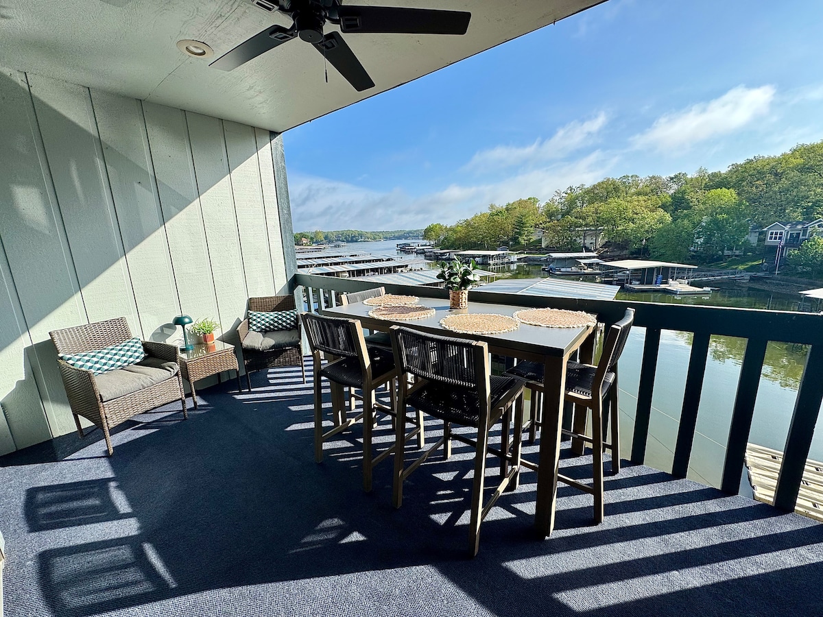 位於奧塞奇海灘(Osage Beach)的迷人一間臥室,配有加大雙人床公寓。景觀迷人!有遮蔽的露台,可俯瞰湖景。翻新的水療浴室,配有義大利大理石。全屋硬木地板。海灣位置/21英里標記。設備包括出租船隻、釣魚、壁爐和泳池!許多精美的餐廳、很棒的購物和陸地/水上好玩新鮮事。全年享受露臺暖氣和電壁爐!可短期/長期租賃