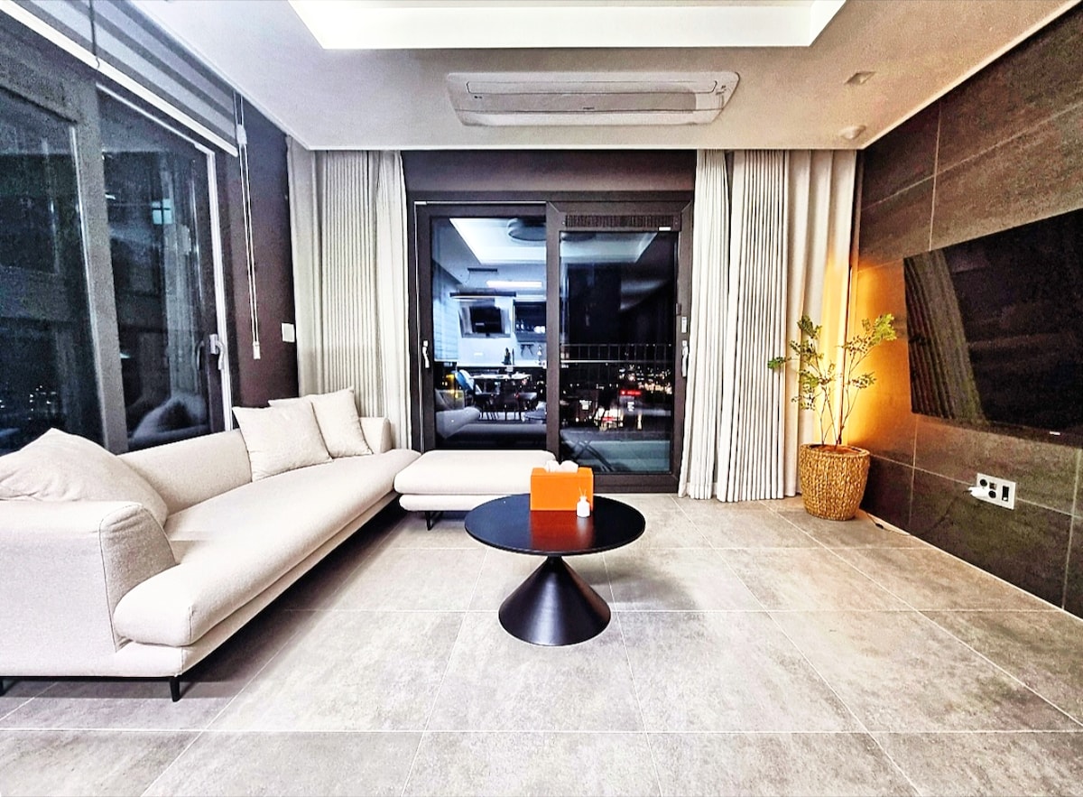 ✨️ 打開客廳窗戶,便可直接通往露天平台,在那裡飽覽目不暇給的海景。 如果你在梳化上休息,然後打開窗戶走到外面, 你可以在露天平台上直接感受到海的氣息。 不只是窗外的景色, 它的不同之處在於你可以直接走到室外,直接享受它。 2 張大床(Queen size)+ 1 張特大床(King size),空間寬敞,並設有浴室 非常適合與家人或朋友一起入住。 露天平台非常適合放鬆身心,在不受陽光刺眼的情況下欣賞海景。 打開窗戶,走出露天平台,立即欣賞海景。 它已註冊並經營為國內和外國人住房共享住宿的法律公司,受🐳釜山Haeundae-gu辦公室和Mrment的特殊情況影響。