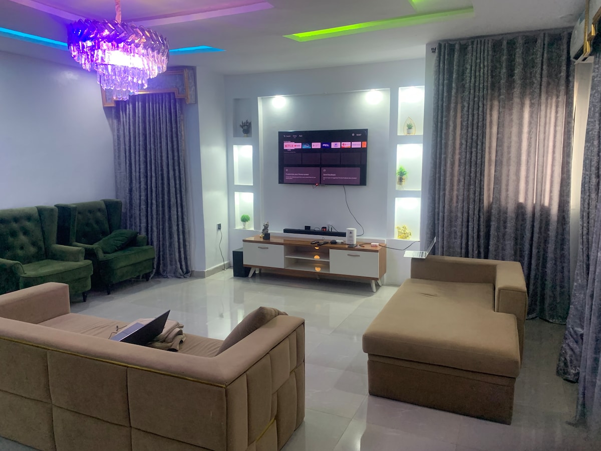 Peerless公寓是一間溫馨寬敞舒適的豪華裝潢齊全的2居室公寓,短租公寓。 空調公寓由2間臥室和1間配有舒適沙發的客廳組成。公寓配有智慧電視,配有DSTV、音響系統、現代照明、熨鬥、馬桶和廚房的熱水器、設備齊全的廚房、餐廳、咖啡桌和房間內的閱讀桌、高度安全的環境和網路,公寓內有休息室。