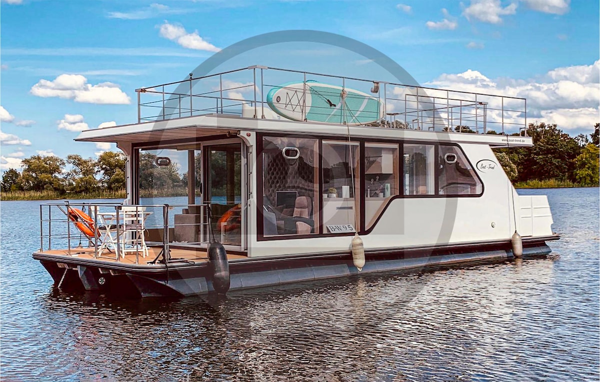 Das festliegende Waterview - Schwimmendes Ferienhaus auf dem Wasser mit Blick zur Havel, inkl Motorboot lädt auf ruhige Stunden auf dem Wasser auf dem Röblinsee/Havel ein. Zwei Schlafzimmer, Klimaanlage, eine ausgestattete Küche, Mikrow., SMART-TV & WLAN bieten einen tollen Urlaub mit einer Portion Abenteuer. Dabei ist dieses floating Home das ideale Ferienhaus auf dem Wasser. Das Fahren des Motorbootes bedarf keinen Führerschein. Das Motorboot & Stand up Board steht zur Nutzung zur Verfügung.