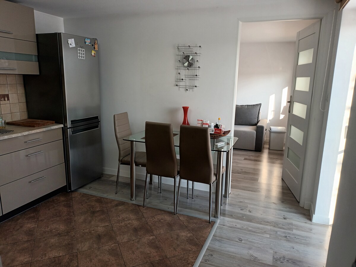 全新多戶住宅公寓,最多可供8人入住。它由兩間臥室、一間配有兩張沙發牀的客廳、一間設備齊全的廚房和一間帶淋浴間的浴室組成。 包括衛星電視、免費WiFi、冰箱、咖啡機、電水壺、微波爐、電爐、三明治機、吹風機、洗衣機、熨鬥。 我們為房客提供水、咖啡、茶、牀單、毛巾、盥洗用品。