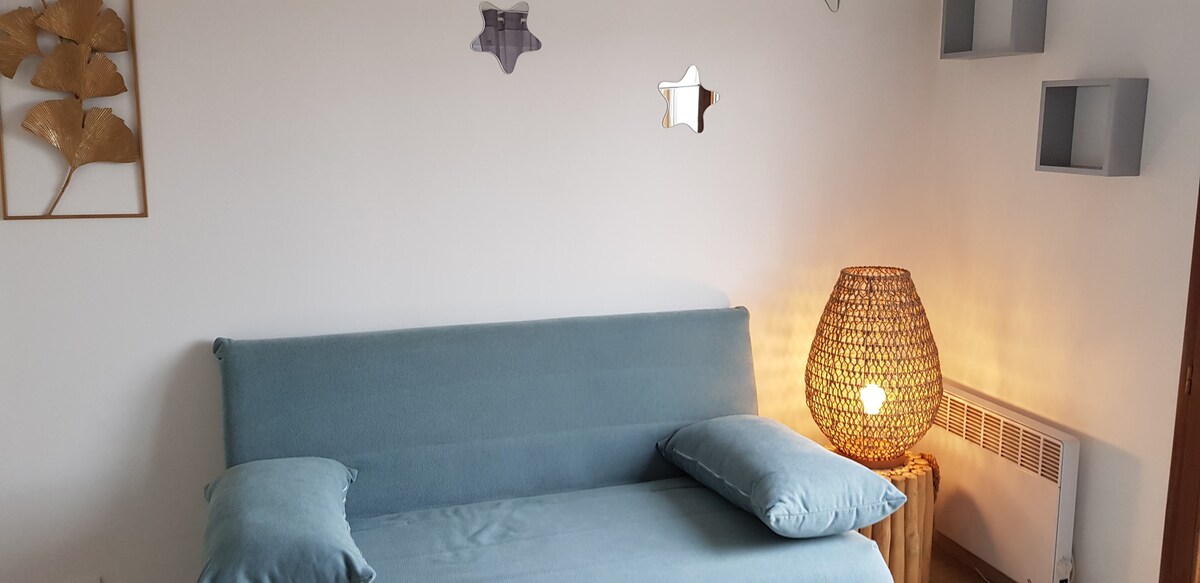 T2 帶露臺,步行 5 分鐘即可抵達海邊、酒吧、餐廳和市中心。 適合2人入住,但可容納4位旅客- 1 間臥室和 1 間帶沙發床的客廳 - 設備齊全的廚房和洗衣機 - 私人露臺,配有花園桌和戶外淋浴 露臺配有休閒椅和植物 WiFi、連線高畫質電視、書籍 - 房源剛剛全面翻新,您將是第一批入住的旅客!