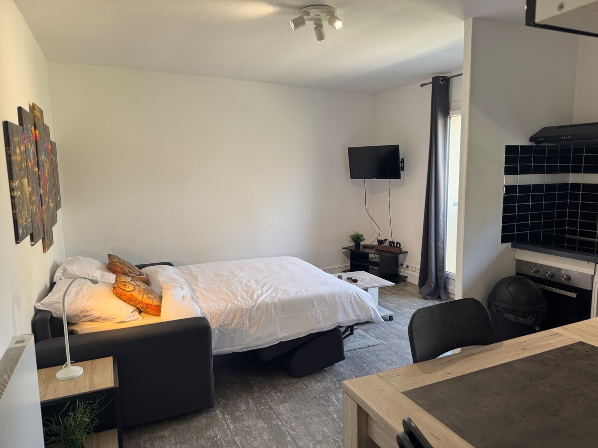 在這個獨特而安靜的住所中放鬆身心。 迷人的單間公寓,位於市中心。一個非常大的露台。有一張可以變成額外床的扶手椅(如果您希望我們為您準備床,如果您只有兩個人,請務必加入 3 個人!!!),開車 20 分鐘即可抵達巴黎和迪士尼,或乘坐交通工具 30 分鐘。 二樓,有電梯,位於一個小型豪華住宅區。 禁止舉辦派對或晚會!!