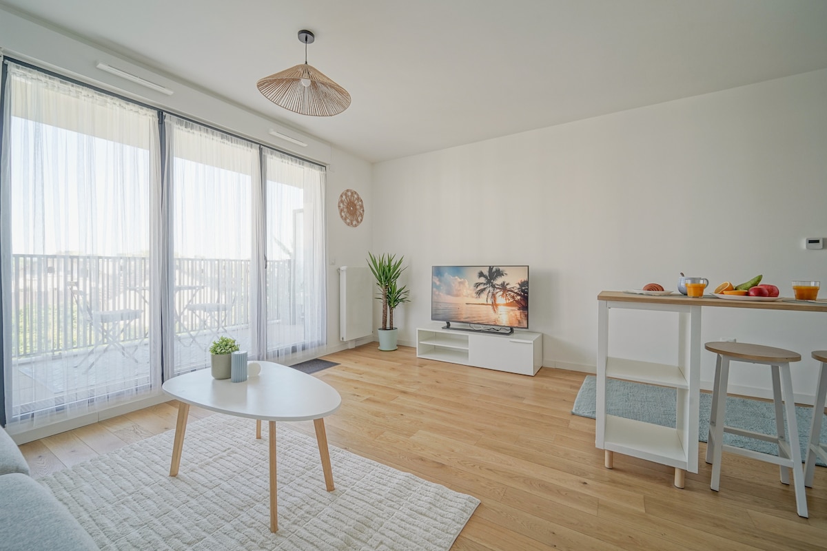 Bienvenue dans ce studio moderne et lumineux avec balcon aménagé donnant sur un agréable jardin 🌿 Idéalement situé : tramway T1 au pied de l’immeuble et métro ligne 5 à quelques minutes, pour rejoindre Paris en toute simplicité. Installez-vous confortablement dans le salon équipé d’un canapé convertible et profitez d’une cuisine entièrement équipée pour vos repas. La salle de bain dispose d’une grande douche et d’une machine à laver. Idéal pour un séjour professionnel ou pour du tourisme.