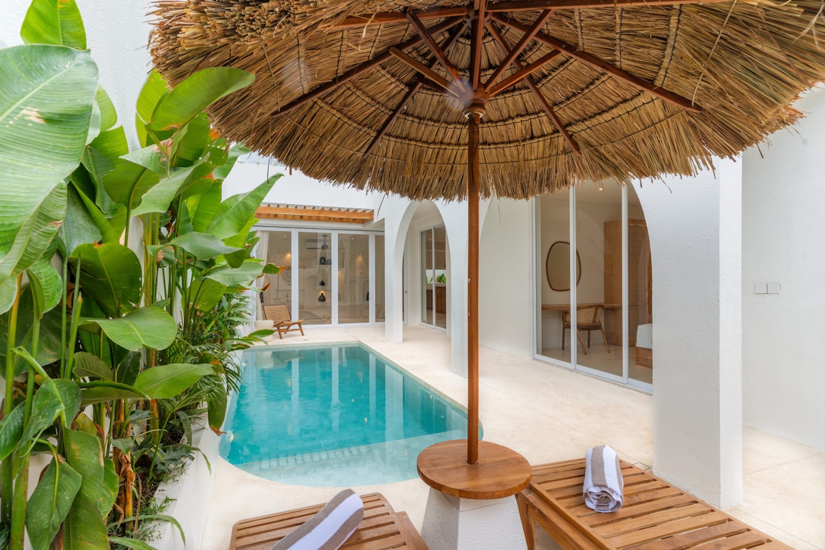 <b>精選設施:</b> - 單位面積 92 平方米 - 枕頭選擇:硬枕或超柔軟羽絨枕 -小型泳池 -桑拿 -花園景觀 - 經RO過濾的水,可安全淋浴和飲用。 在大自然的聲音中醒來,步入你的私人花園綠洲,那裡設有小型泳池、下沉式座位區,四周更是植物茂密。 專為尋求安靜奢華和細心休息的情侶或獨行旅客而設計。 只需多付一點,即可享受更大空間和更多設施:https://airbnb.com/h/lru-e