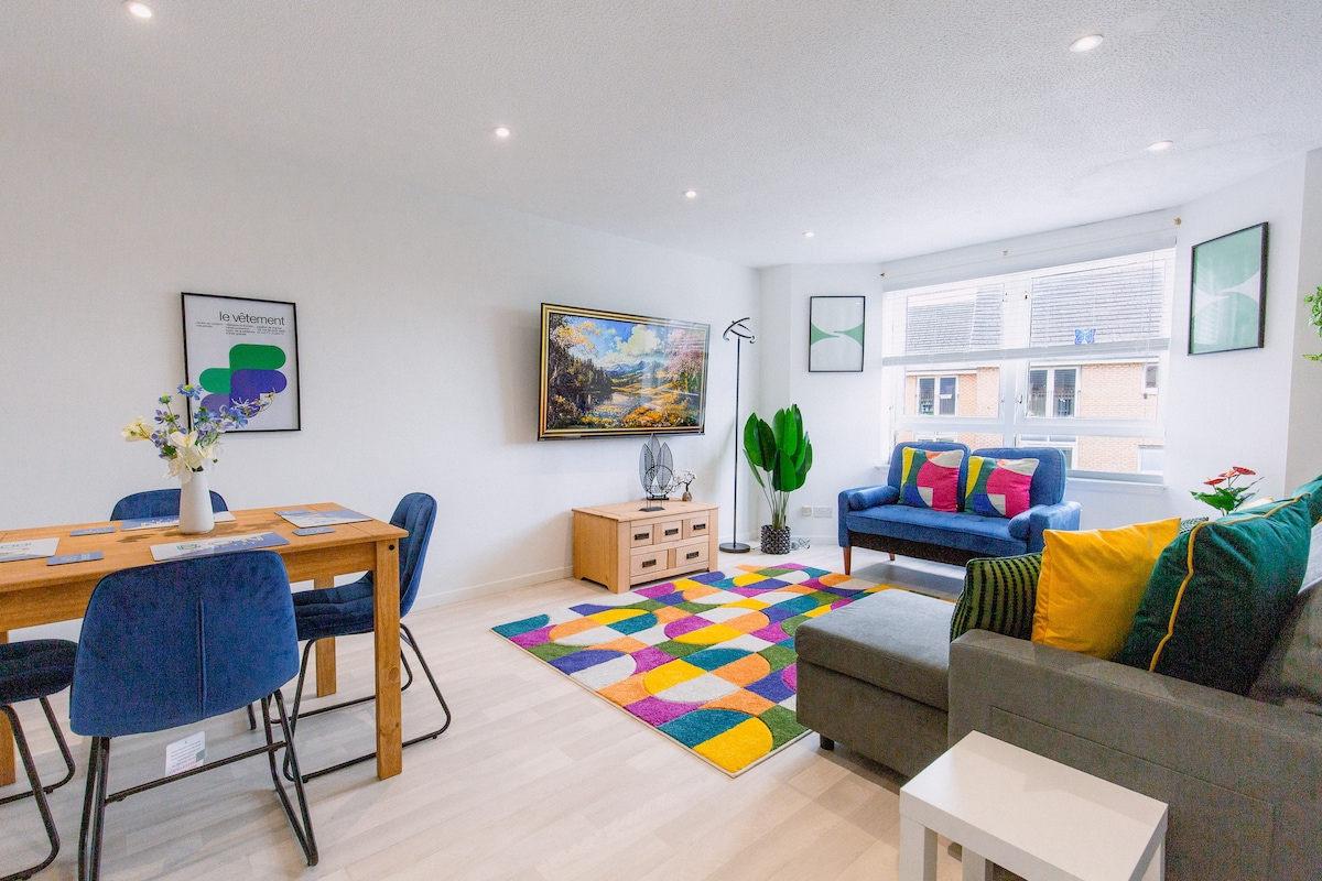 華麗的一樓2間臥室公寓,位於通勤小鎮約翰斯通的一個安靜區域。 步行2分鐘即可抵達火車站,距離格拉斯哥市中心僅2站路。 格拉斯哥機場開車10分鐘,到洛蒙德湖25分鐘,距離格拉斯哥市15分鐘,距離M8高速公路1英里。 您距離許多高評價餐廳、超市僅幾分鐘路程,步行即可抵達,提供床單、毛巾、免費WiFi、50英寸電視,可免費觀看、Netflix和Amazon prime