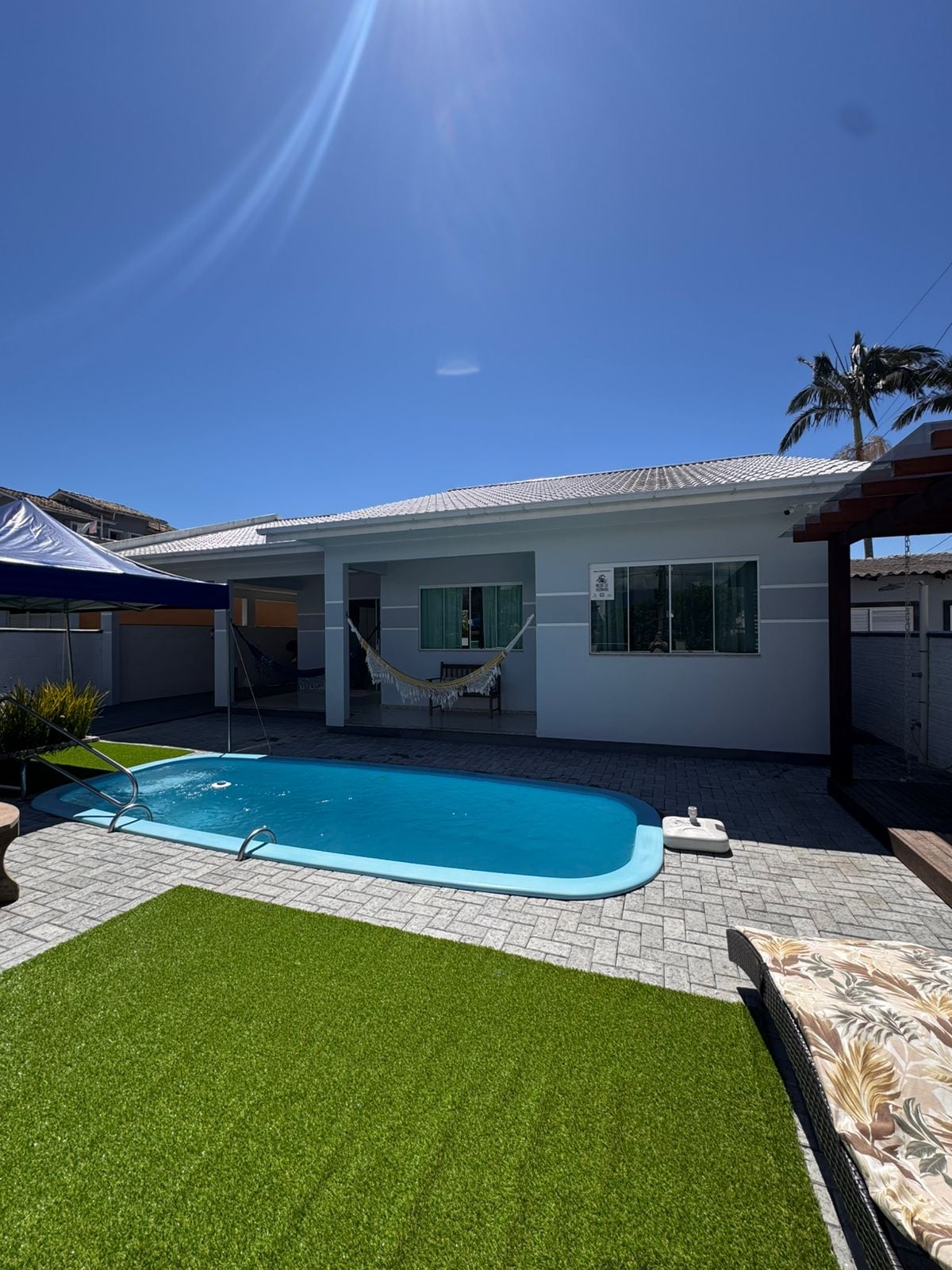 Casa espaçosa, com três quartos, ar condicionado em todos, churrasqueira, piscina, garagem e espaço no pátio. Rua tranquila, com pouco trânsito de pessoas e veículos; 200m da praia; Fácil acesso as praias do Sonho e Guarda do Embaú; Mercado a 100m. É feito a limpeza da piscina 1x na semana, caso o hóspede tenha interesse, pode contratar mais limpezas diretamente com o piscineiro.