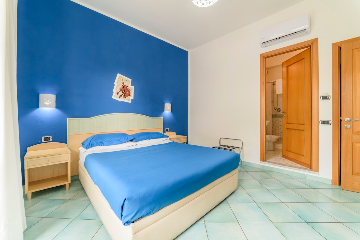La camera matrimoniale offre un ampio terrazzo privato . Dispone di ingresso esterno autonomo, bagno interno privato con doccia, climatizzatore, cassetta di sicurezza e mini-frigo. Il terrazzo, con vista mare laterale, è attrezzato con sedie e tavolino, garantendo agli ospiti un ampio spazio esterno privato.
