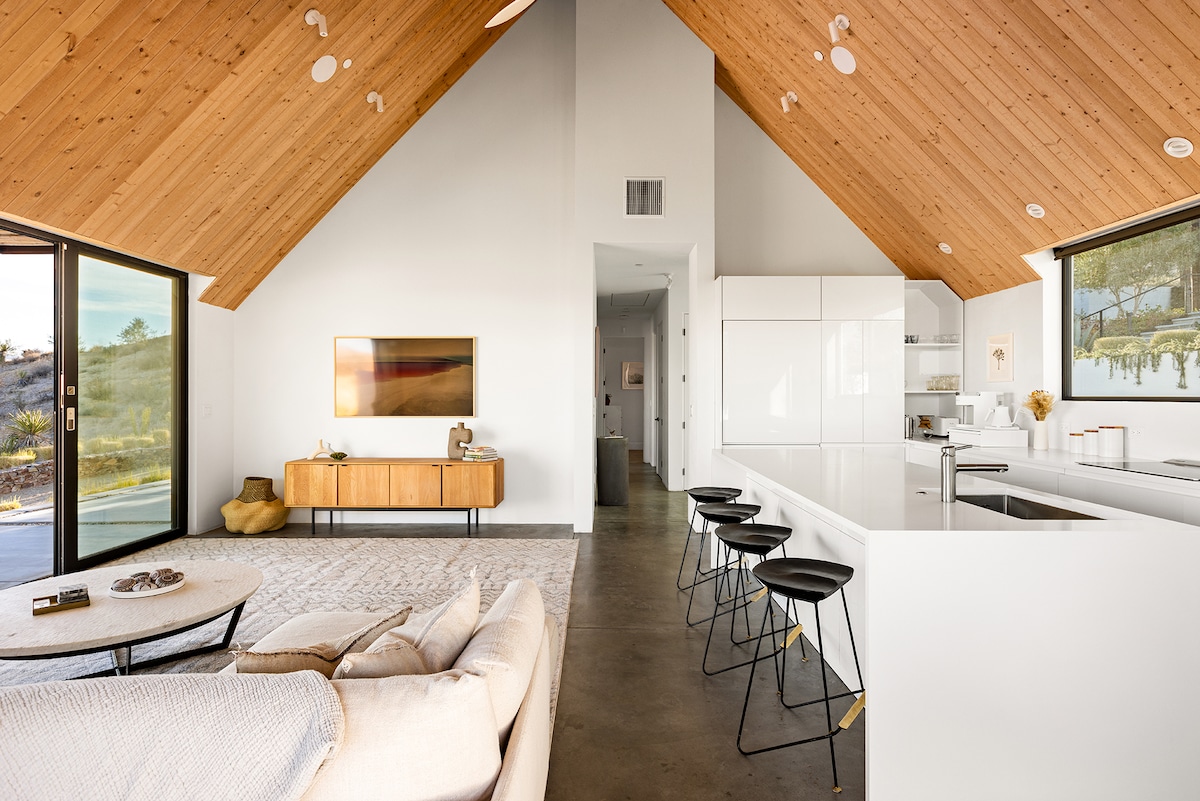 The Rum Runner。經典沙漠自耕農的現代風格。 亮點包括: -按摩浴池 -烤肉架 -特斯拉充電器 -多個火坑 -降落傘床單 -Sonos音響系統 -無盡的沙漠景觀 -多個牛仔浴缸 -設備齊全的廚房 -戶外觀星日光浴床 -大型遮蔭露臺,可戶外用餐 -帶8x20 '伸縮玻璃牆的日光房 -由當地藝術家Ana Digiallonardo設計的室內壁畫