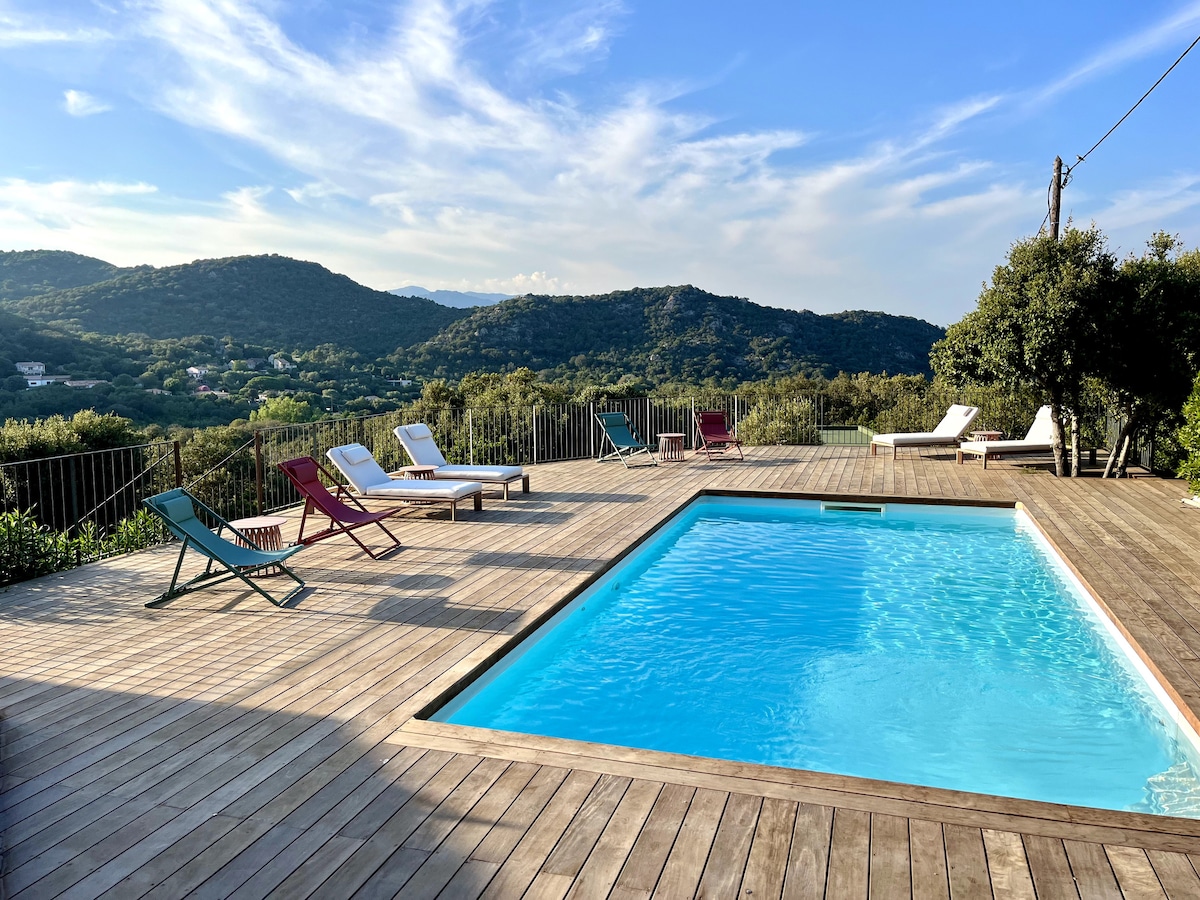 La villa est un mélange réussi de tradition et modernité. L’extérieur est tout en pierre avec une petite piscine lovée dans les rochers. Elle offre une vue sur le golfe de Porto Vecchio et un accès plage à 3 min. 💫🏖☀️🌊