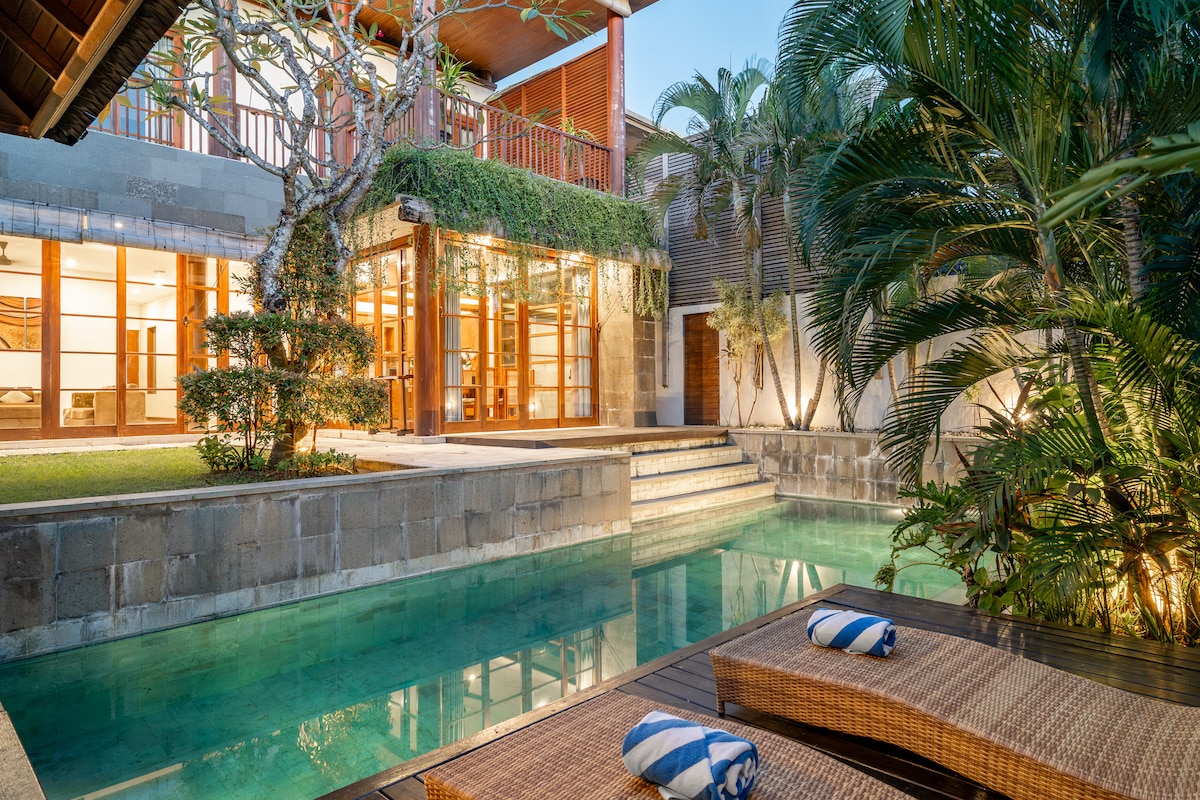 別墅坐落在水明漾(Seminyak)和坎古(Canggu)之間迷人的熱帶別墅區,佔地150公尺,步行4分鐘即可抵達日落海灘,有許多可愛的咖啡廳和海灘俱樂部。別墅提供每日清潔服務、早餐、配有日光浴床的私人泳池、大型起居區、設備齊全的廚房、配有浴缸和室外淋浴間的露天浴室。