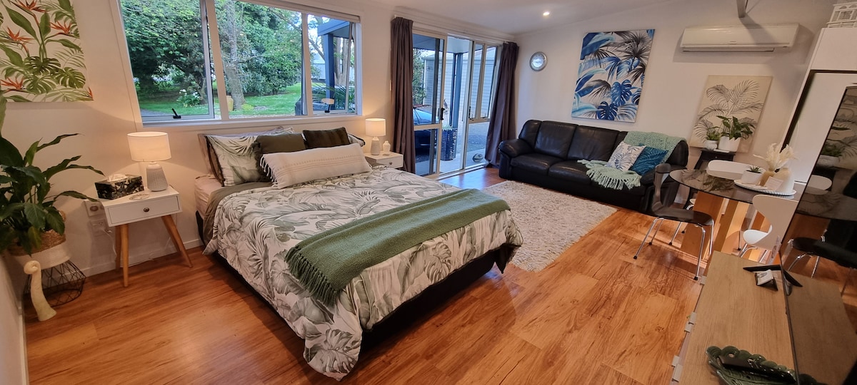Nestled in tranquil rural Pyes Pa, just 4 km from town essentials, this private and spacious studio offers an ideal retreat for couples seeking relaxation. Enjoy a secluded tropical courtyard complete with a chiminea, sunset deck overlooking serene countryside hills, a salt water pool (shared with hosts but full privacy given). Ample safe parking for trailers, bikes, boats, campervans. Conveniently located off Tauranga direct road from Rotorua, perfect for those travelling through.