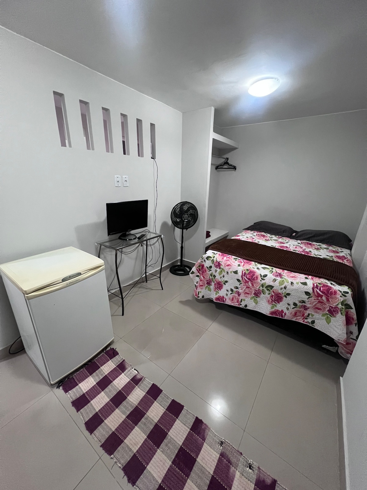 Quarto simples bem pequeno e banheiro sem box, ideal para quem vem a trabalho. No quarto, tem mesa de estudos, TV e ventilador. Somente o quarto.