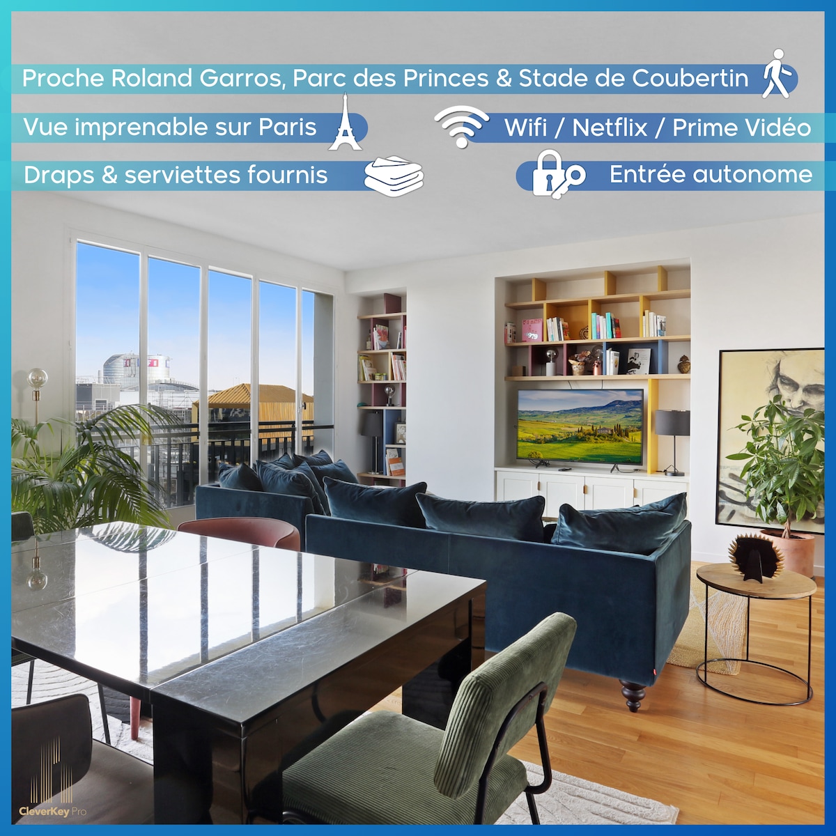 享受難忘的住宿體驗,欣賞首都的壯麗全景:從拉德芳斯(La Défense)到蒙帕納斯大樓(Montparnasse Tower),途經雄偉的埃菲爾鐵塔和聖心大教堂。 這間寬敞明亮的公寓地理位置優越,面向Stade Coubertin,距離Roland-Garros僅幾步之遙,靠近Stade Jean-Bouin和Parc des Princes。 在巴黎的熱鬧中心體驗一個真正的寧靜天堂:在享受絕對寧靜的同時,體驗偉大的體育賽事。