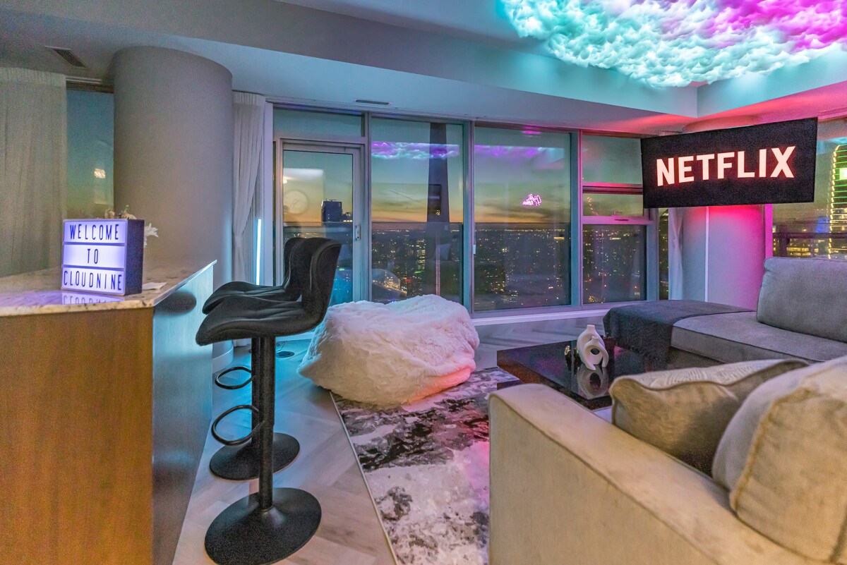 This lakeside condo is designed to give you a 5-star experience. Upon entrance you are greeted with champagne and a gift basket! Steps away from the main attractions. Walk to the CN Tower, Scotia Bank Arena, Rogers Centre, Ontario Place, Cinesphere Theatre, Budweiser Stage, Historic Fort York, Billy Bishop Airport (YTZ), BMO Field, and more! Enjoy your 5-star stay with our amenities including an indoor pool, jacuzzi, sauna, odyssey gym (located on the same floor), outdoor roof top hot tub!