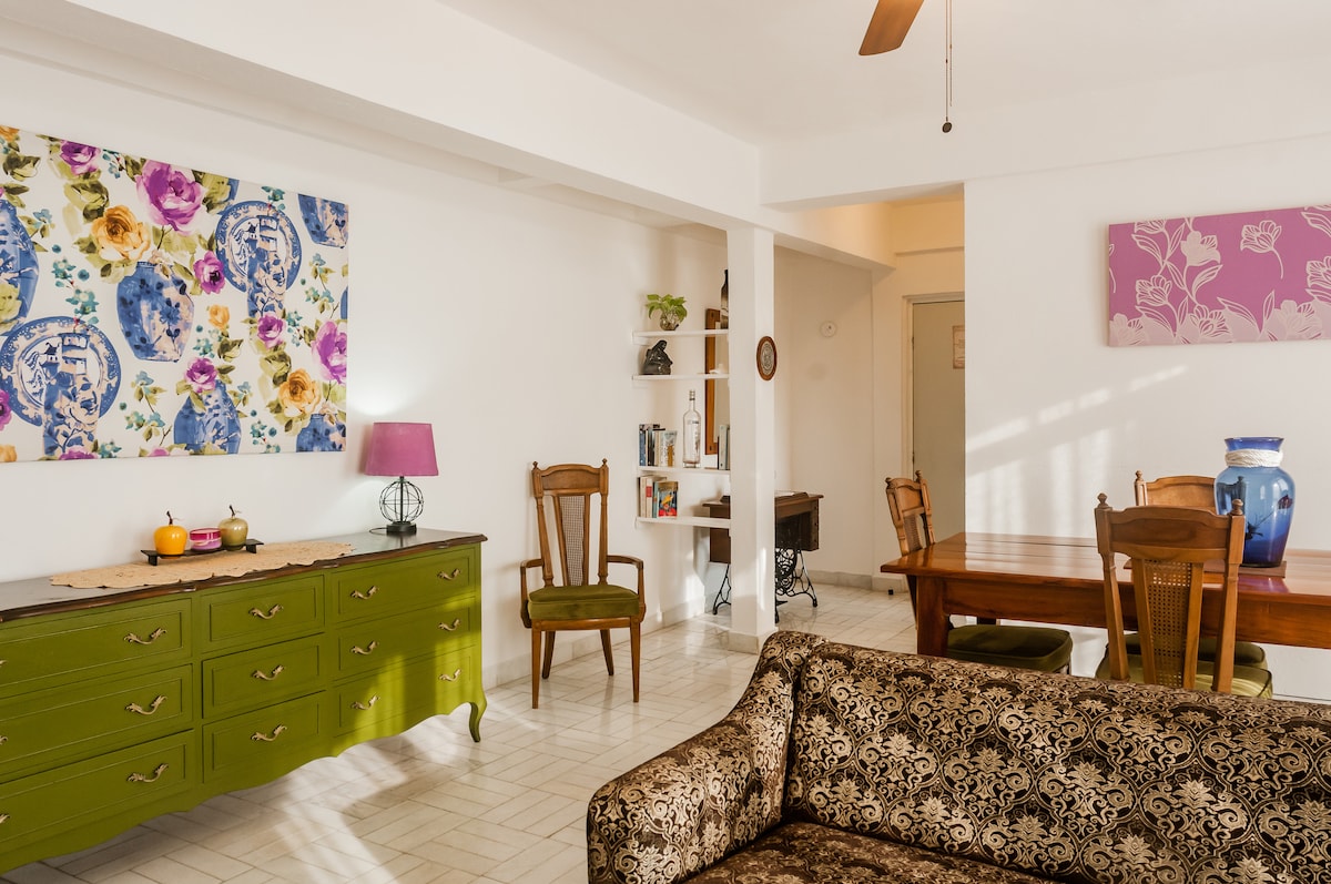 公寓位於高樓層,非常靠近市中心,靠近主要的商業廣場和克爾公園,您可以在早上在那裡鍛鍊身體。它位於一個安靜的區域,晚上有保安人員。拐角處有洗衣店、素食店、Oxxo 和 Soriana,您可以在那裡購物。幾個街區外有餐廳和銀行。轉角處有巴士,可前往酒店區。 空調 Wi-Fi 智慧電視和有線電視 熱水 安全