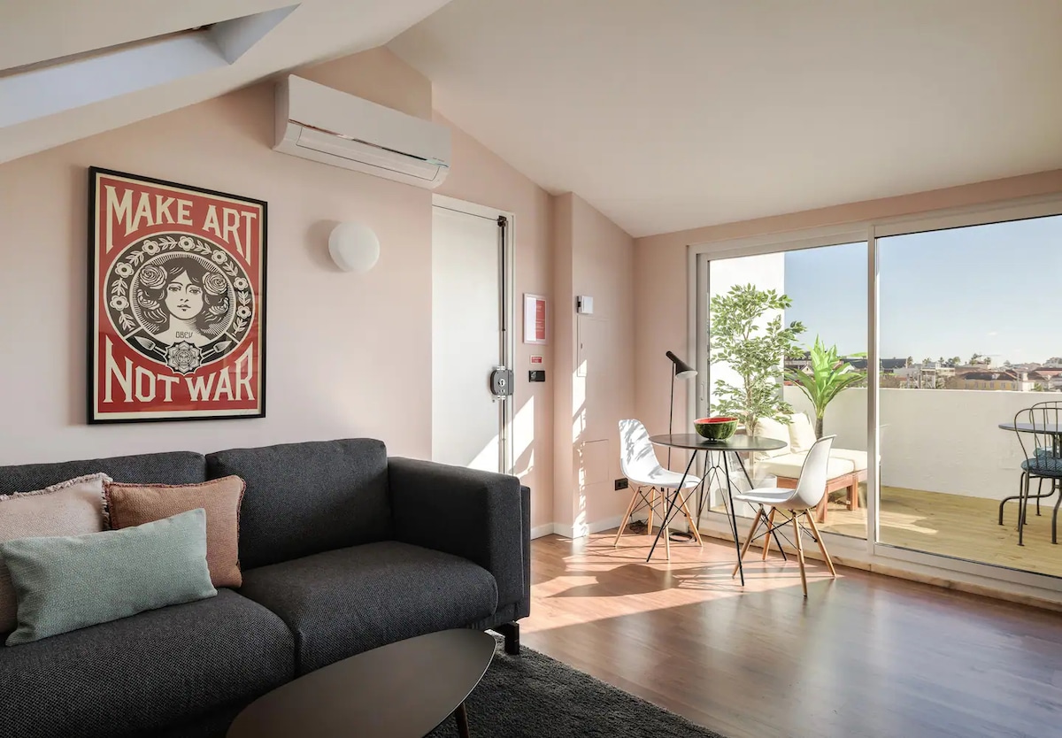 時尚的 1 臥室屋頂公寓,配有私人露臺,可欣賞聖喬治城堡和塔古斯河的美景。位於里斯本市中心,位於Marques de Pombal ,靠近標誌性的Eduardo VII公園和Avenida da Liberdade。 ⚠️請注意,隔壁有建築工程,白天可能會有噪音* * 您可以從戶外螺旋樓梯前往屋頂公寓。由於樓梯的原因,請注意,此公寓不適合行動不便者入住。