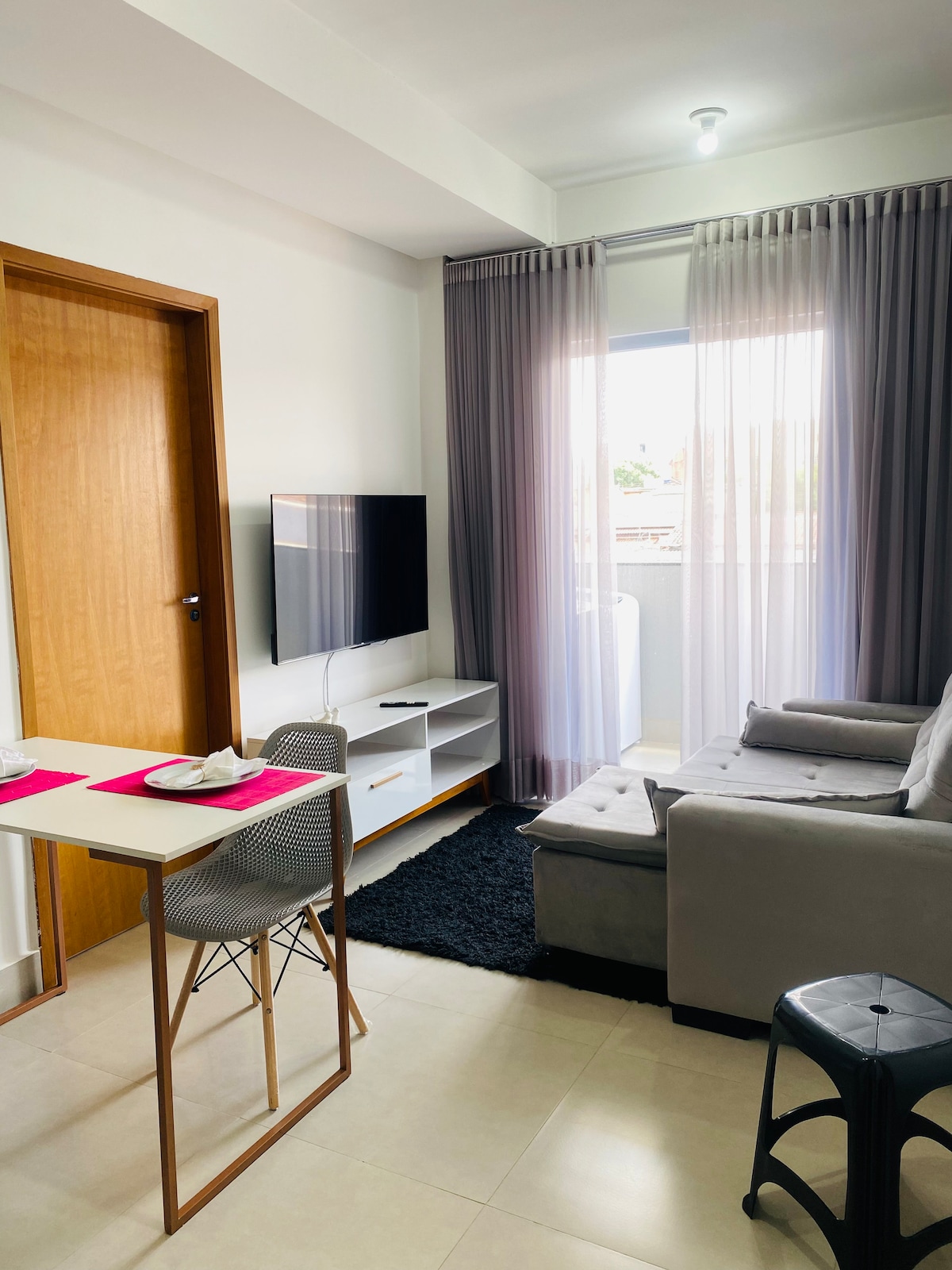 整套公寓配有家具、Wi-Fi、車庫,安靜、通風且舒適。 適合「短期住宿」。 大樓位於市中心的公民廣場後面的一條街上,因此靠近一切。它也非常靠近Bosque dos Buritis和Feira da Lua (300公尺)。 建築物的形狀像披薩包裝,因此客廳和臥室都呈梯形。