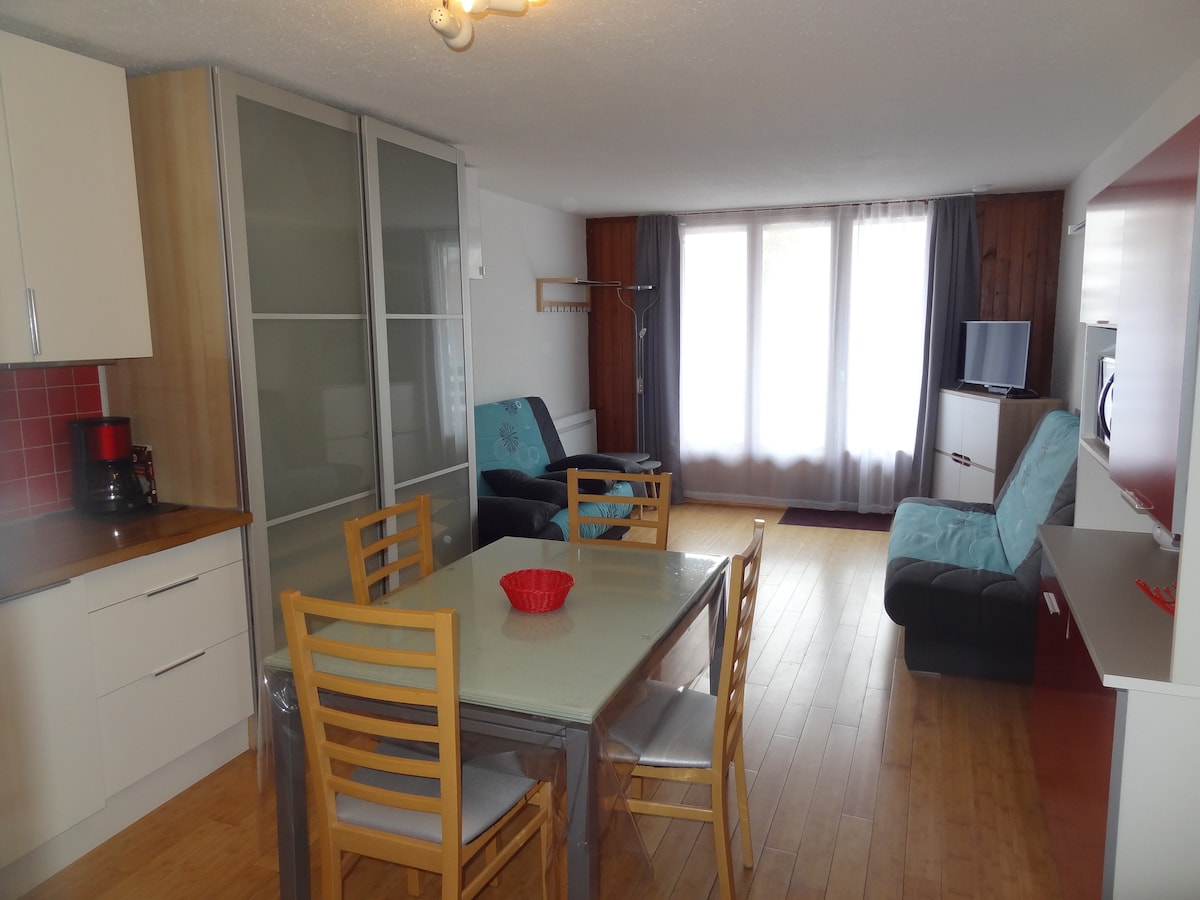 漂亮的公寓,步行8分鐘即可抵達斜坡,全新翻修,陽臺可欣賞無盡的景觀。 它有兩間臥室,配有90公分牀(加大雙人牀可選) ,客廳配有140公分沙發牀。 還有一個全功能浴室,配有烘乾機和獨立廁所。 廚房配有洗碗機、洗衣機、洗衣機、烤箱、烤箱、烤箱、微波爐、微波爐和Nespresso。 它配備了所有必要的餐具:烤麵包機、水壺、榨汁機和攪拌機。 車庫有自己的車庫和儲藏室