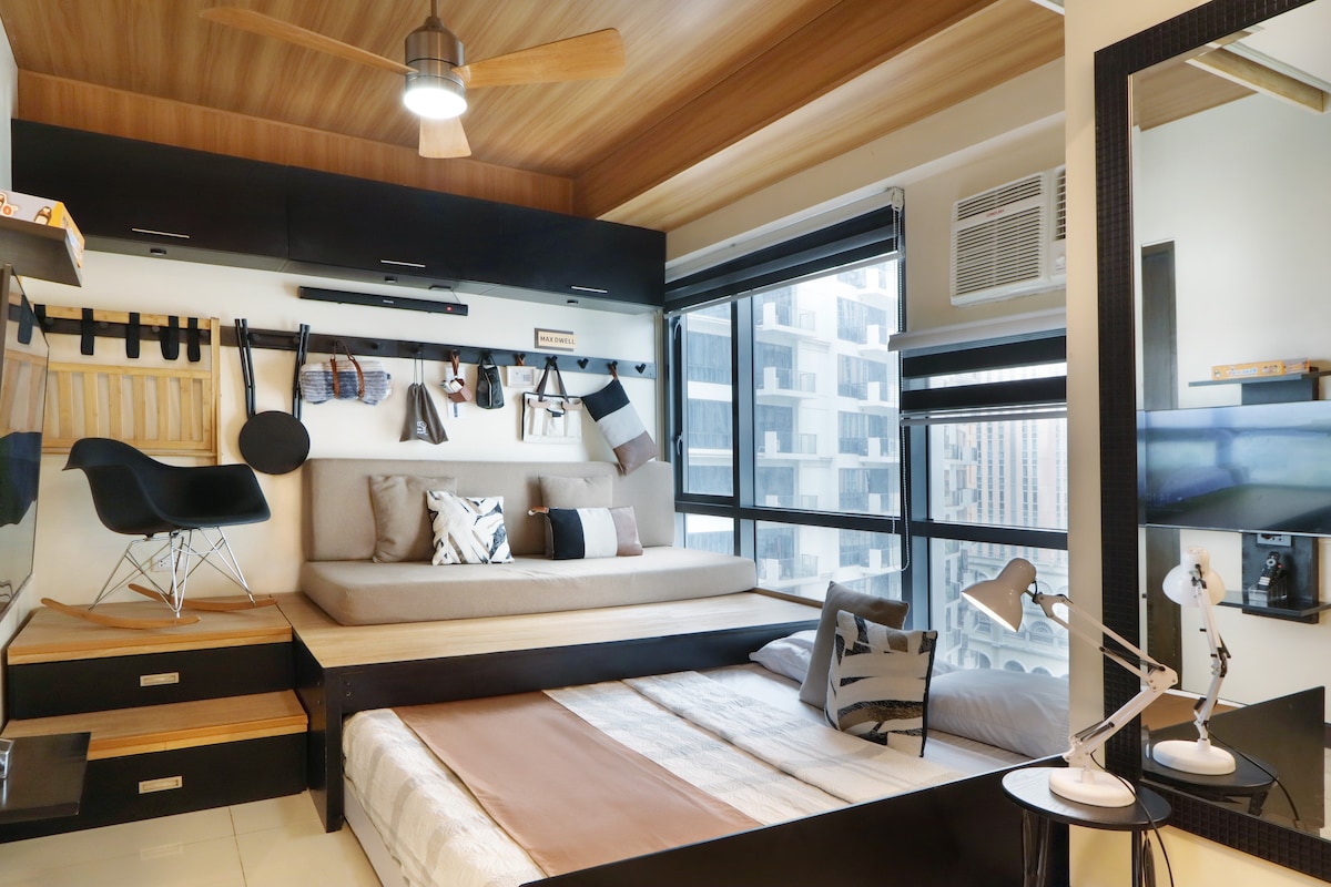 Experience style and convenience in this modern BGC studio! Just a 2-minute walk to Venice Canal Mall, it’s perfect for work and leisure. Enjoy a hidden pullout queen bed, an expanding table for dining or work, and an 84” projector for a cinematic experience. Steps from cafes, groceries, and restaurants, everything you need is within reach. Whether you're unwinding, exploring, or working remotely, this cozy retreat is the ideal staycation spot! 🎬🎮✨