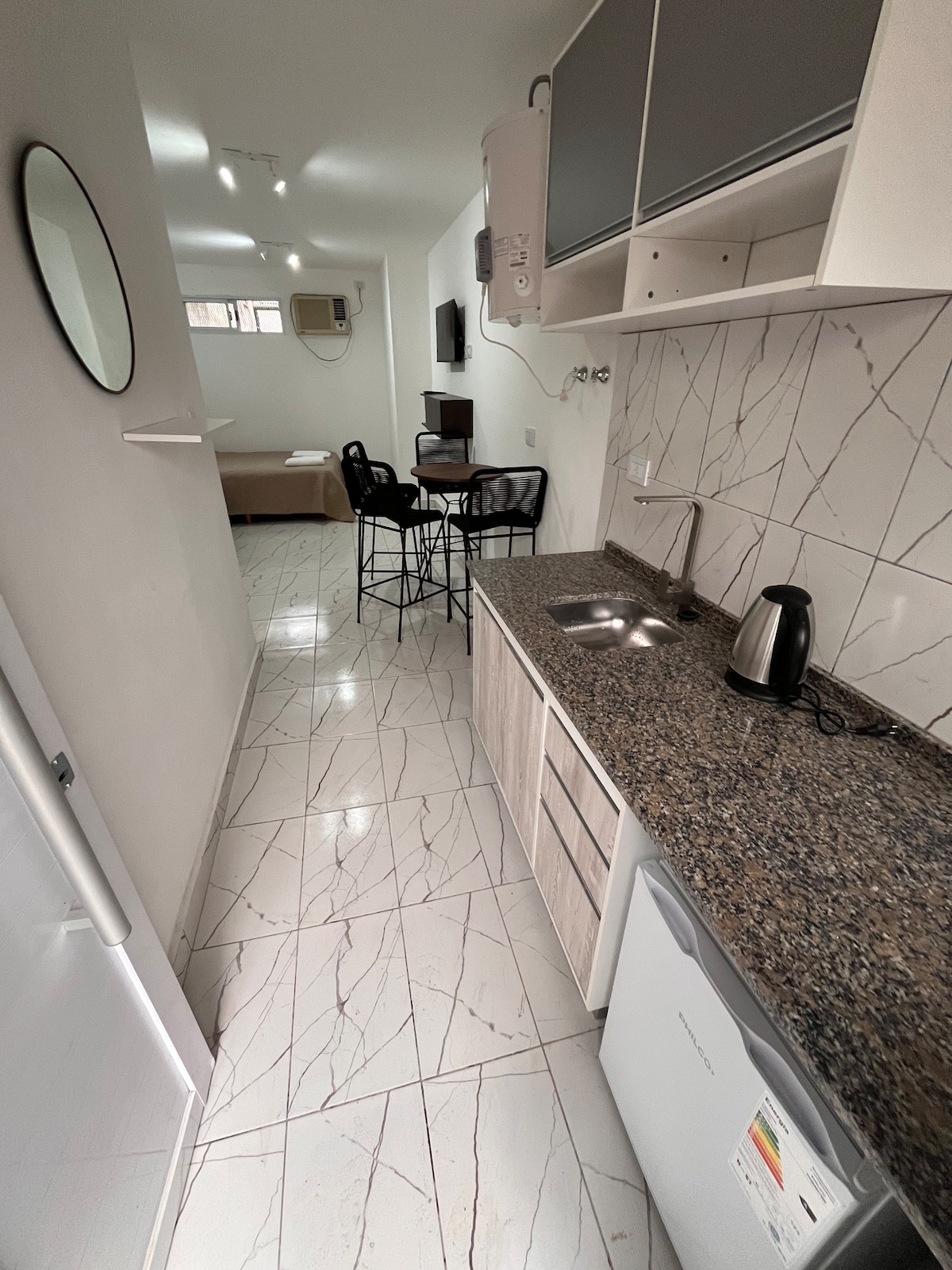 Monoambiente Alegre在Paso de los Libres市中心提供舒適安全的住宿。 它有私人停車位、保安攝影機和免費WiFi。 這是一個獨立的空間,非常適合在繼續旅程之前休息。 它有冷熱空調和乾式早餐(茶、咖啡、餅乾和水)。 配備齊全的床上用品、毛巾、智能電視、迷你吧、電熱水壺、烤箱和廚房用具。