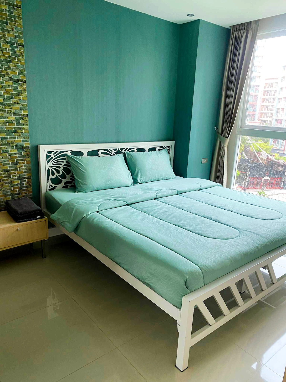 38平米一居室,带有独立的阳台,面向漂亮的迪士尼通话一般的泳池和花园。 公寓提供免费停车位,桑拿房,健身房,大泳池,儿童滑梯,台球室(付费)。 公寓位于芭提雅Thep praya主路,24小时双条车,门口7-11便利店,芭提雅最正宗的牛排餐厅,马路对面啤酒屋。 5分钟乘车到达中天海滩,10分钟到达芭提雅市中心,交通方便出行方便,步行5分钟到达中天巴士站。