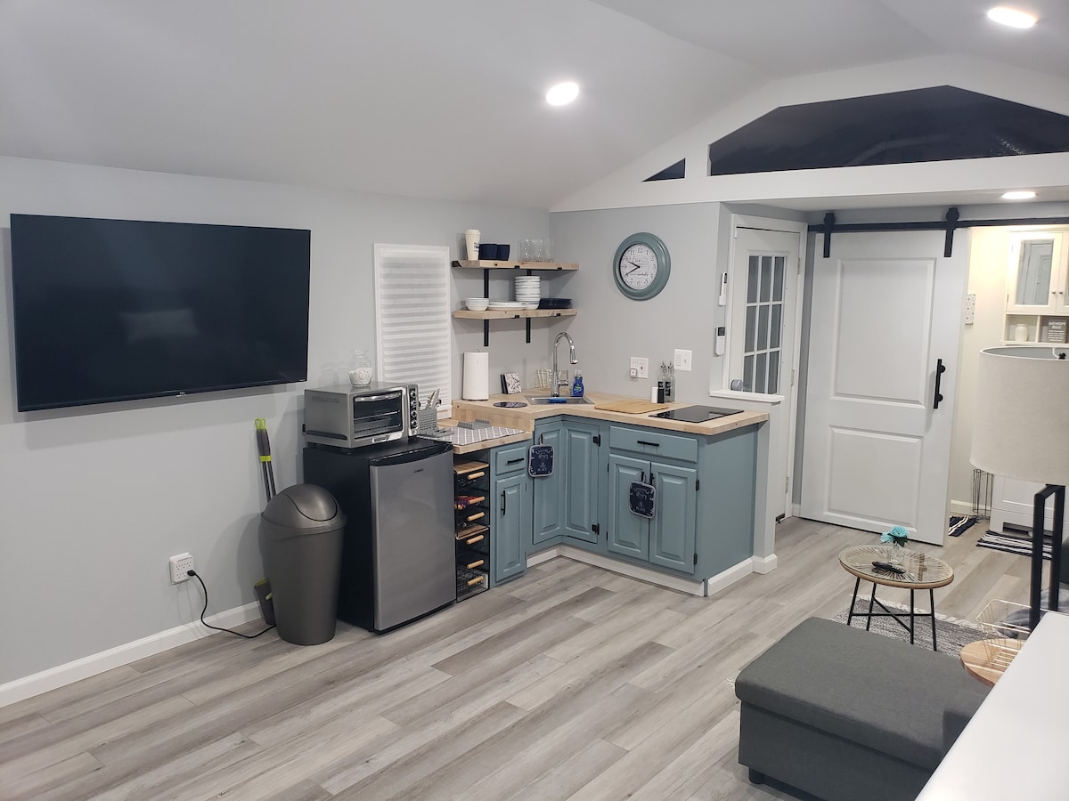 Newly renovated, immaculate two room tiny home. A stand-alone gem nestled against a wooded backdrop - well back from the main home - and wrapped in a huge, teak-furnished, blue stone patio with fire pit situated in a sunny opening in the mature tree canopy. Super comfy queen Murphy bed offers easy conversion of the well lit and modern main living space from living room & kitchen by day to main sleeping quarters at night. The adjoining room is a well appointed full bath and dressing area.