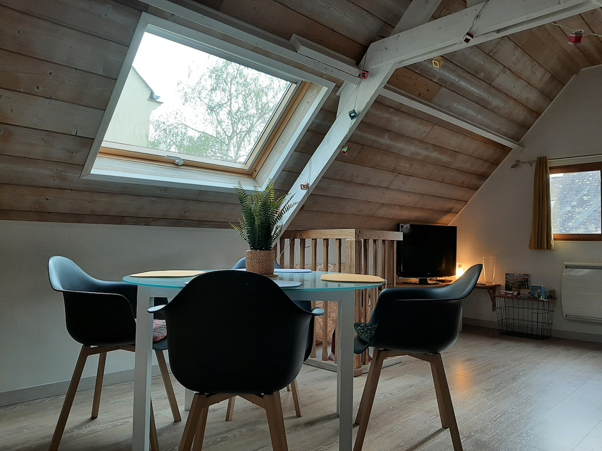 迷人的木製度假木屋,坐落在村莊中心的一條安靜的小街上,距離河流50公尺。 快速前往許多當地商店(麵包店、藥店、雜貨店、煙草吧、餐廳等)徒步或自行車道。 設備齊全的住宿,有獨立露臺。 距離Angers市中心10分鐘,靠近Terra Botanica和Aqua Vita 10分鐘。