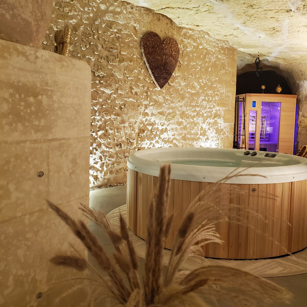 Maison semi troglodyte au charme romantique, idéalement située entre Tours et Amboise comprenant : - Pièce à vivre troglo : cuisine équipée (petit déjeuner pour séjours de 1 et 2 nuits), séjour et salon. - Suite non troglo : chambre et salle d'eau, literie Emma 160 cm, douche à l'italienne. - Espace bien être privatif en illimité avec spa , sauna infrarouge, et table de massage (modelages corps sur demande et en option auprès d'une spécialiste professionnelle des soins bien être