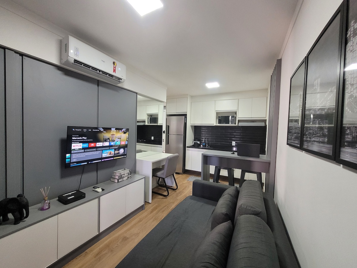 住宿2週可享八折優惠, 1個月住宿可享50%折扣。 公寓配有空調,舒適,地理位置完美! Bauru Shopping、Unesp、USP、CPO、Centrinho和購物中心的一側。 設有電子門的免費停車位
