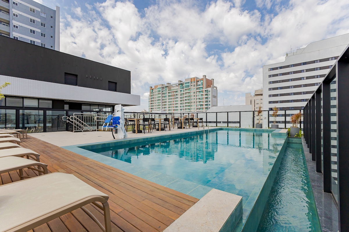 現代化的單間公寓,全新、舒適、地理位置完美,陽臺景觀美麗,尤其是在夜間。快速Wi-Fi、辦公桌、55英寸智慧電視、標準雙人床。空調(冷/暖)。 洗衣機和烘乾機,以及一個漂亮的廚房島。 50 平方公尺,非常時尚 - 27 樓,安靜。 位於市中心/Batel,靠近商店、銀行、購物中心、美食中心和醫院。 大樓內:游泳池、健身房、遊戲室、桑拿、按摩浴缸、24小時門衛。