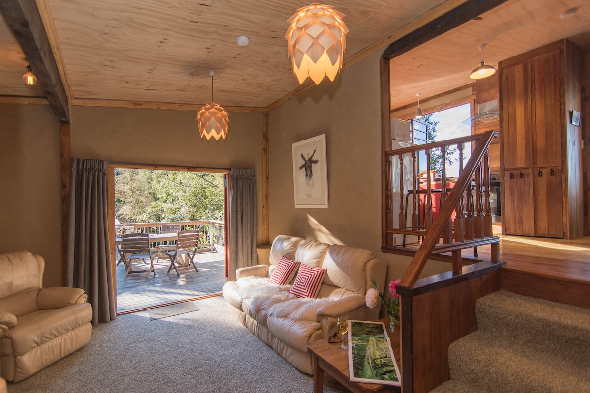 Relax & unwind in total privacy with breathtaking views. Peel Forest Scenic Park is a beautiful protected rainforest. 'The Lookout' sits high in the tree tops. Surrounded by forest & birdlife, walks to waterfalls, ancient trees & mountains on your doorstep. Secluded, warm, clean and comfy-guests describe it as “A Dream”. Great for couples, families, & large groups. 5 mins to Green Man Cafe & Bar. Price includes luxury linen, toiletries, cereal, tea & coffee, exit clean. Free wifi & parking.