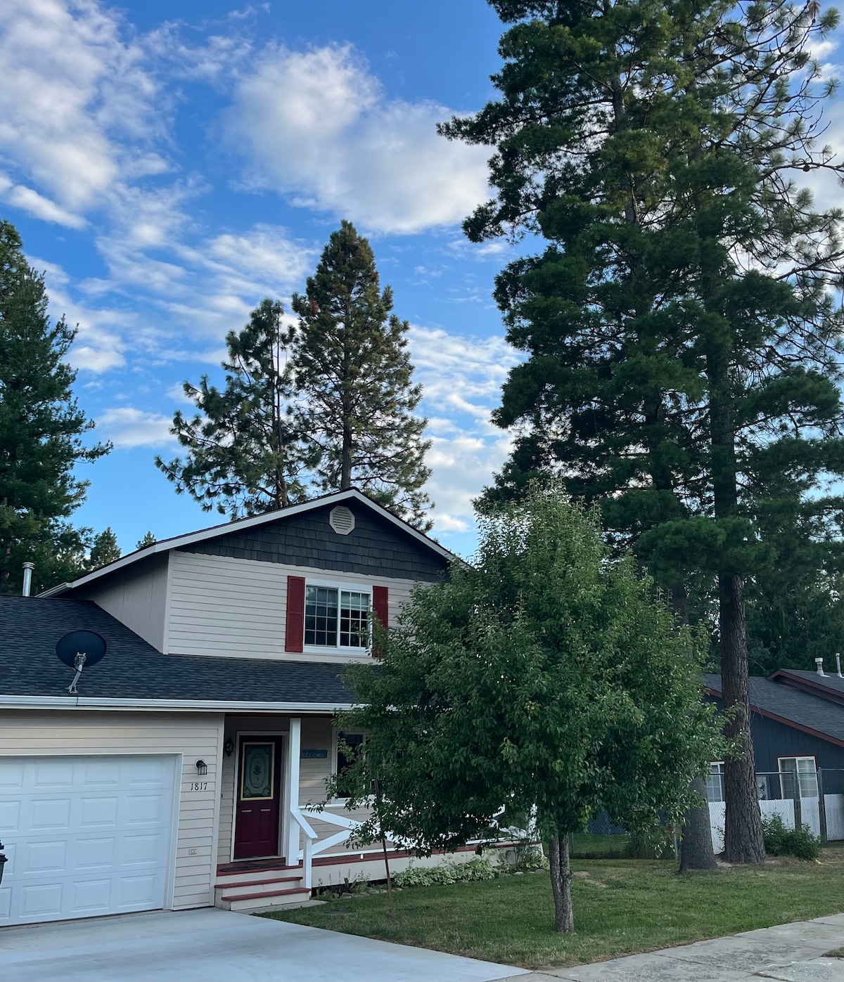 1350 s.f. home, 1.5 miles to town, across from elementary school field. Full house AC. Open concept downstairs. Fully equipped spacious kitchen. Nicely furnished throughout. 2 Full Bathrooms; one upstairs, one downstairs. 2 large bdrms upstairs; New Queen beds in 2025. Third bed is Very Comfortable Queen sofa sleeper in Living room. Downstairs office can be used as bedroom w/ Queen aerobed. Large backyard. Tall trees / mountain views. Easily accommodates 6 people. Read our guest Reviews!