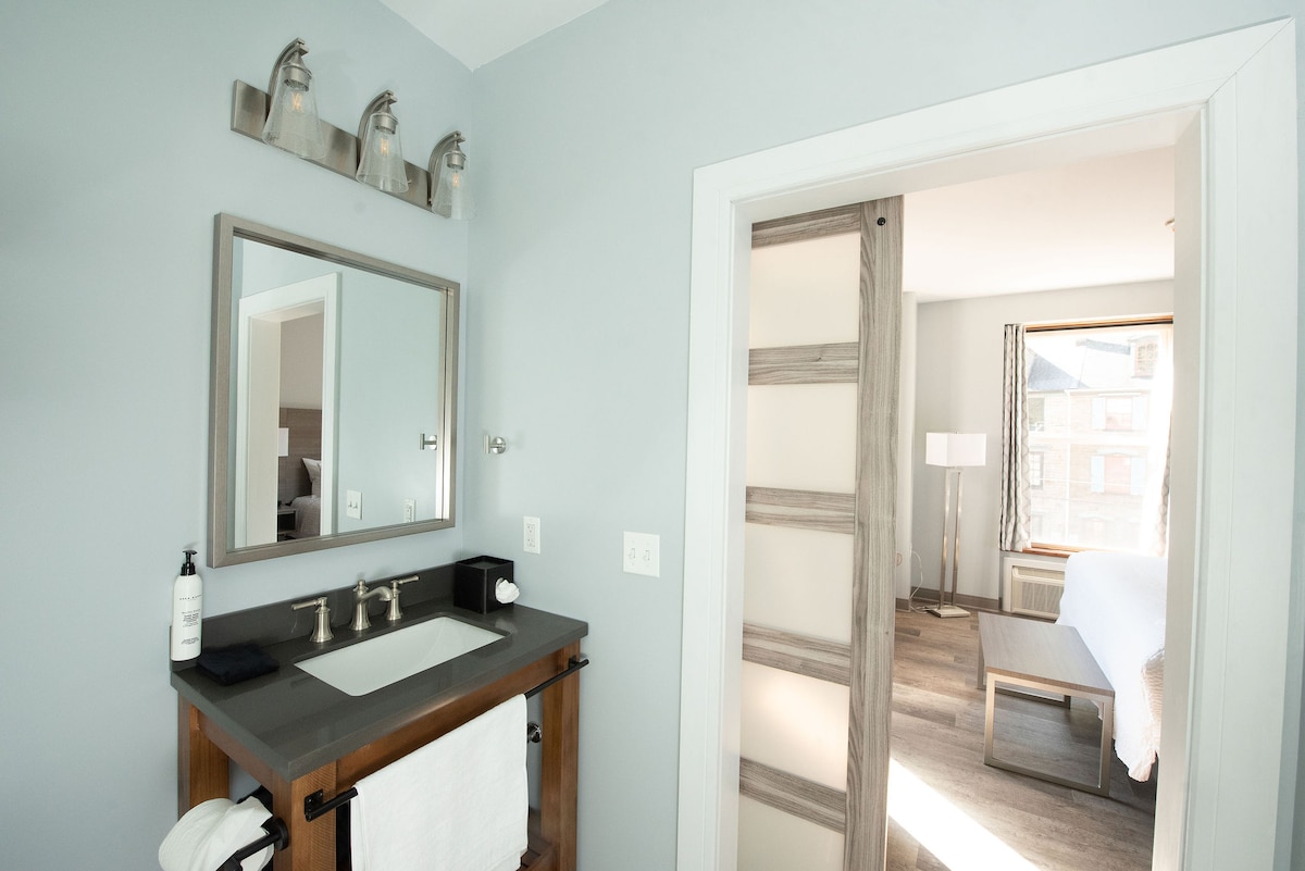 這間寬敞的套房設有高級和開放式的起居、用餐/工作區域和全功能廚房,分隔兩間標準雙人床臥室和配有淋浴間的私人寬敞浴室。 套房設有7扇大型窗戶,整個空間充滿自然光線,並可欣賞Frankford Ave的景觀。 現場可提供額外的停車位。 可用性受限。先到先得。 歡迎寵物(每隻寵物 100 美元) 如有需要,可提供雙人床(每晚 25 美元)。