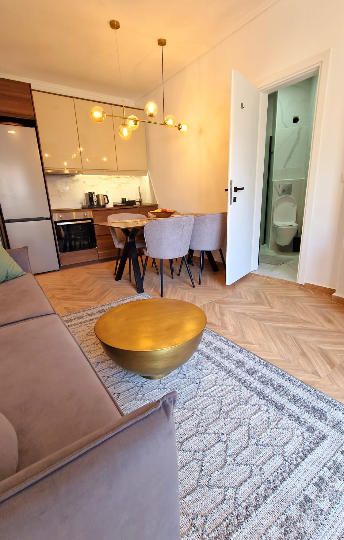 這間海濱公寓結合了精緻的優雅和舒適。 起居區域明亮開放,配有舒適的家具和大窗戶,可欣賞海灘景觀。 時尚的休息室角落採用柔和的照明和裝飾裝飾,營造出輕鬆的感覺。 開放式廚房時尚且實用,配有現代家電和中央島嶼。 臥室平靜而簡約,配有大地色調和開放式浴室。 非常適合輕鬆優雅的海濱生活方式。