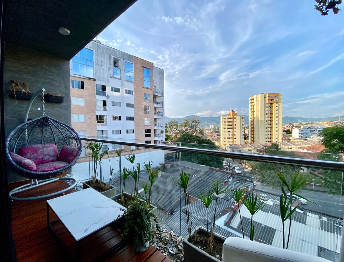 Apartamento con todas las comodidades en Pereira, ubicación privilegiada en la circunvalar, en edificio moderno, cerca al centro comercial Arboleda, al lado del "Club del Comercio", con aire acondicionado (Pereira es una ciudad de clima cálido), TV de 65 pulgadas, ventanas insonorizadas, cama queen, parqueadero cubierto privado y todas las comodidades para tu estadía óptima en el eje cafetero. Estratégicamente ubicado, a poca distancia de restaurantes, cafés, supermercados y vida nocturna