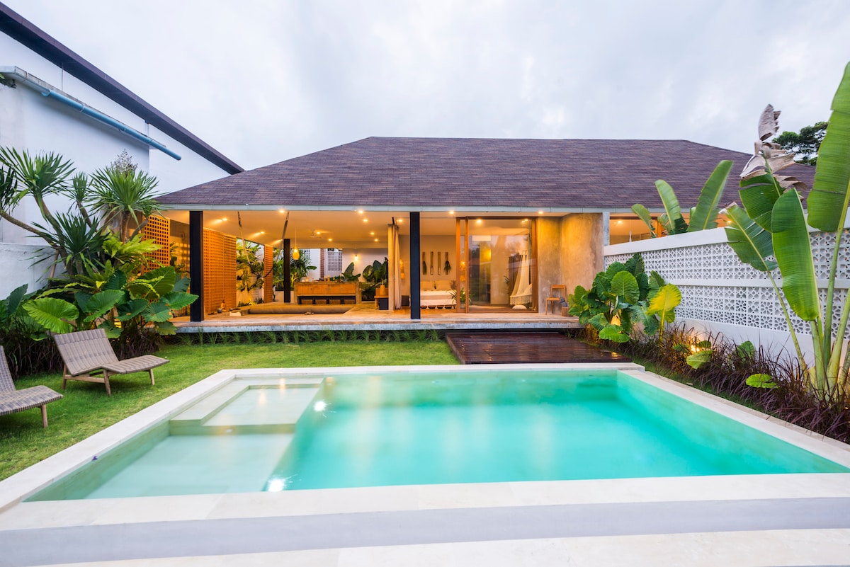 入住我們全新的 1 間臥室別墅,配有私人泳池,位於 Canggu 中心的絕佳位置,這是情侶或獨遊旅客的完美別墅,他們喜歡探索 Canggu 的著名景點。步行3-5分鐘即可抵達很棒的餐廳、商店、健身房、共同工作空間、普拉提、咖啡廳和酒吧。距離著名的海灘僅幾分鐘路程,如Nelayan、Batu Bolong、Canggu Beach,這間別墅配有豪華的加大雙人床、套房浴室、廚房、泳池、客廳和開放式起居空間,可在私人泳池旁放鬆身心
