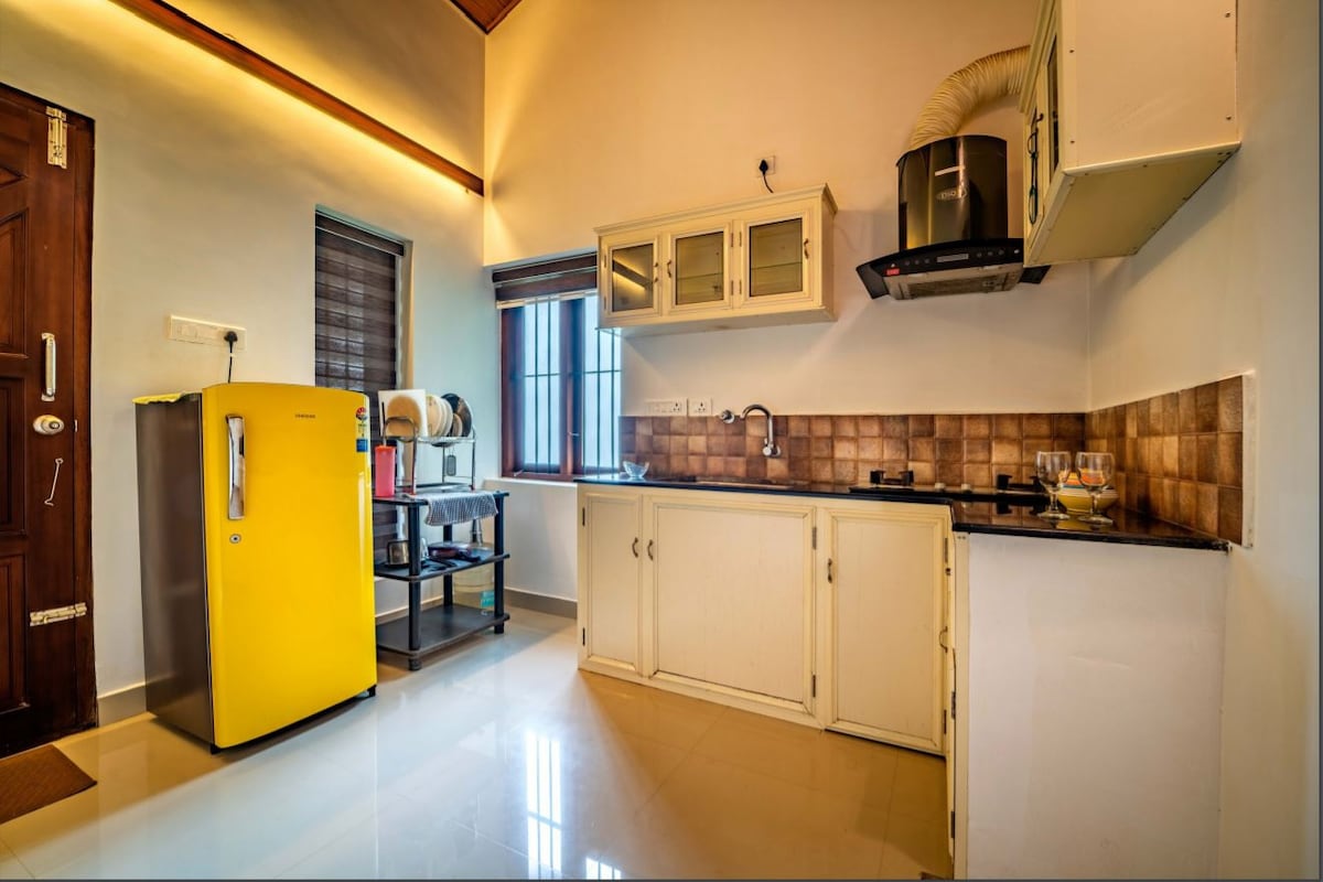 🌿 這間優雅的2BHK全套家具別墅是一個有門禁的40英畝大院中的兩間別墅之一。 🏡 位於連接科欽國際機場和埃爾納庫拉姆的高速公路附近。 步行即可抵達地鐵站,可快速前往市內的熱門景點。 🛏️ 摘要 私人大門大院,有足夠的泊車位。 非常適合尋求安全、舒適和便利的家庭。 請注意:我們只歡迎家庭團體。 其他旅人請在預訂前發送訊息給我們。