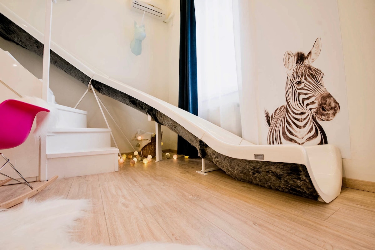 The stylish apartment has been fully renovated with eclectic-modern design in a turn of the century house. The studio is on the 4th floor and have a nice view of the city from the windows. Located in one of the most fashionable areas of Budapest with city’s best bars, pubs, restaurants, museums, galleries, designer clothing boutiques, shops and historical architecture at your doorstep. The playful apartment has a slide from the gallery, fully equipped kitchen and a modern bathroom.
