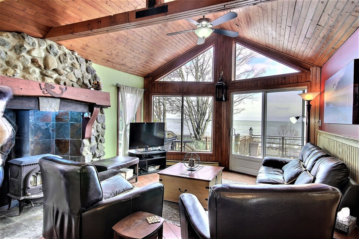 Situé sur un chemin privé, magnifique maison de campagne avec vue spectaculaire sur le fleuve St-Laurent. Toit cathédrale avec foyer double face. La grande verrière de 28 pieds ainsi que les 2 chambres à coucher font face au coucher de soleil. Electroménagers haut-de-gamme. Terrain boisé et intime de 140 000pi carré avec accès à un petit lac. Patinoire naturelle en hiver. Terrasse extérieure avec BBQ. Foyer extérieur. Une propriété au cachet unique. Non-fumeurs, pas d'animaux Verrière 3 saisons