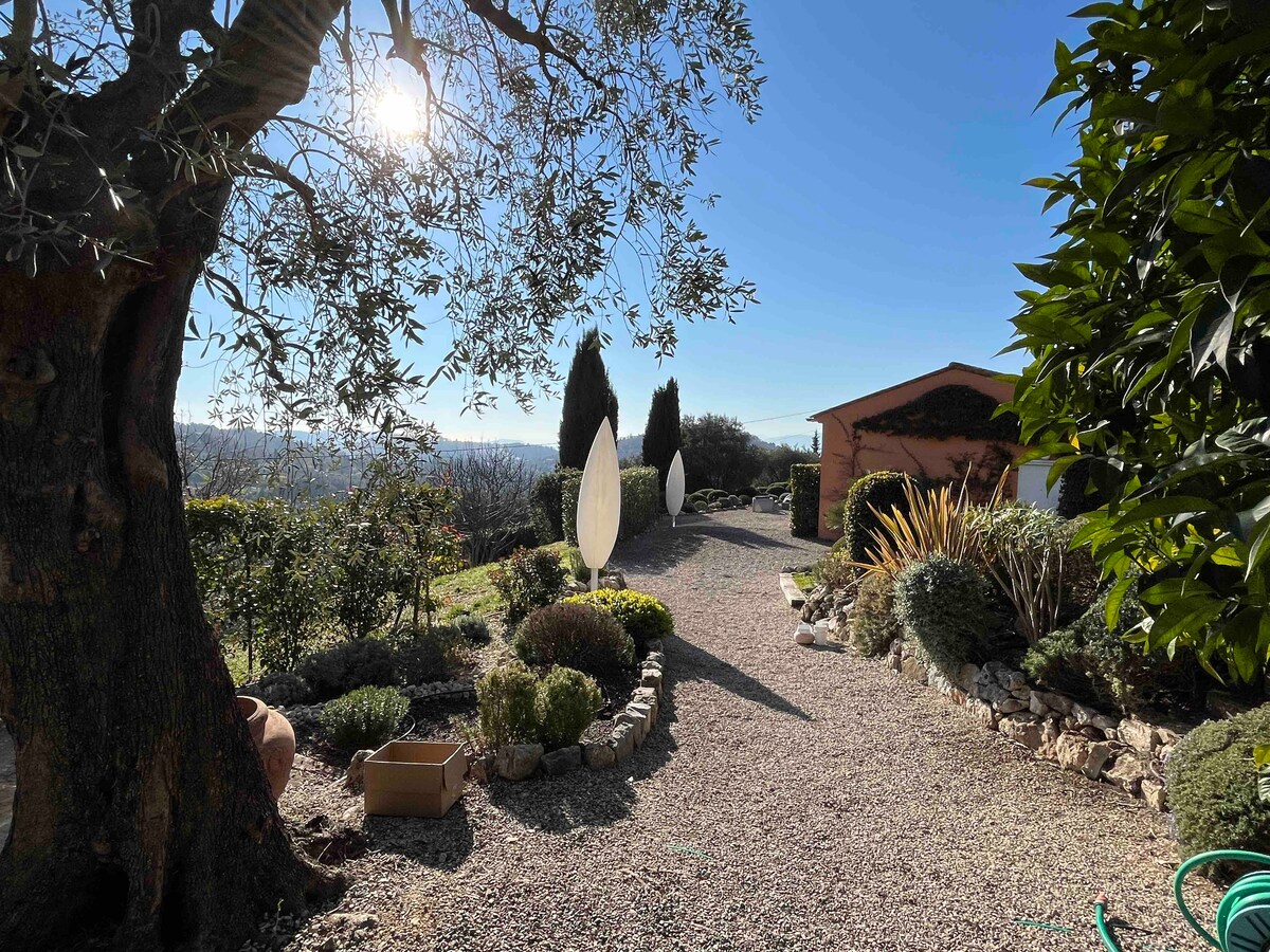 80平方米的大型公寓,有一間臥室,位於我們別墅的獨立翼。大型神奇花園。 不容忽視。2個泳池,包括按摩浴缸和瑞典浴,預訂後加熱。 神奇的環境。海景/山景 有蓋露台戶外桌 泳池露台。燒烤通道。 廚房:烤箱、電磁爐、冰箱、Smeg洗碗機。 帶馬桶和舒適毛巾烘乾機的淋浴間。 jotul燃木爐。 遮光窗簾、大型DVD電視螢幕、停車位