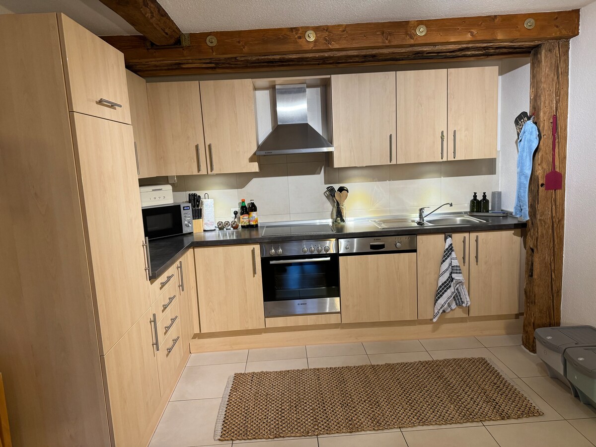 住在德國第三大酒桶正上方的全新翻修公寓。這間獨特的公寓位於普費德爾巴赫 (Pfedelbach) 的中心,位於 1600 年的所謂「長建築」(Langen Bau) 中。臥室正下方是霍恩洛厄親王的前酒窖,那裡的酒桶至今仍然存在。優雅且功能齊全的設備,讓您無需擔心任何需求。公寓正前方還有一個私人停車位。還有一個小型私人露臺。