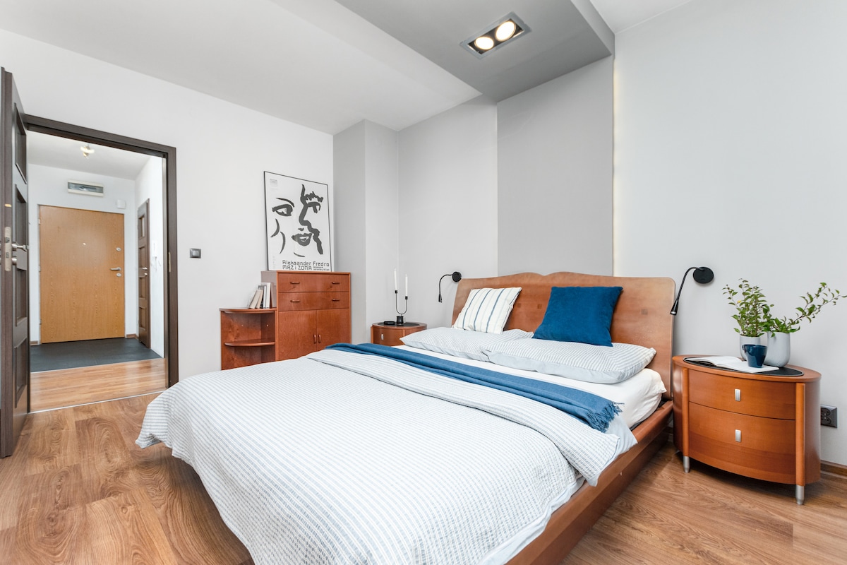 現代化公寓,配有私人露台和按摩浴缸(最高40°C )。 適合情侶、在城市放鬆或遠程工作🫧的完美地方。 *私人按摩浴池 * 30平方米露台,配有日光浴躺椅 *公共區域的健身室和桑拿 * 70吋智能電視和PS4 *地下車庫免費泊車 *全套廚房和強大的Wi-Fi 位於綠地區,靠近Czerniakowskie湖、Zawady海灘、Morysin保護區 備註: -禁止寵物入住、禁止在公寓內吸煙,禁止舉辦派對。