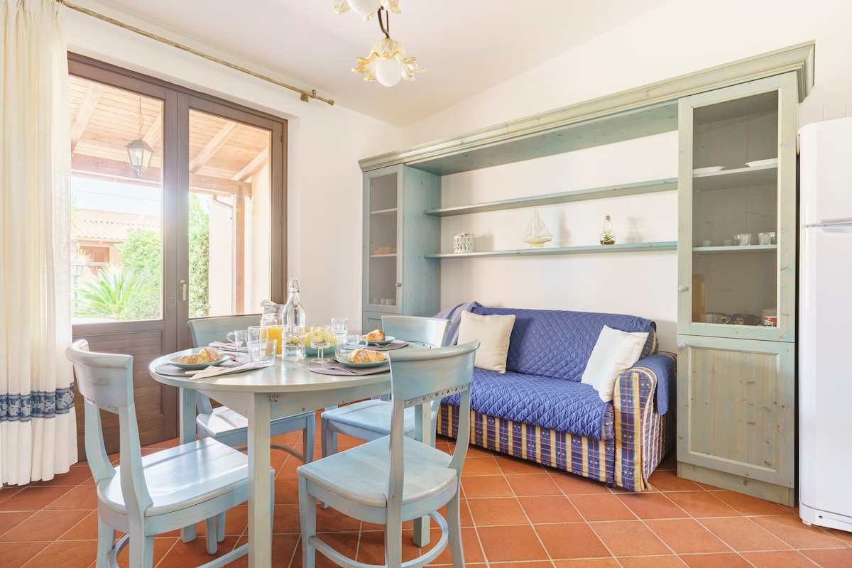 Cod. CIN: IT081020C2CZ6YLN9N. Elegante Villetta Unifamiliare, all'interno di Residence "I Giardini di San Vito",parte alta di San Vito lo Capo. La casa di 60 mq, dispone di una camera da letto matrimoniale, una camera doppia, bagno con doccia e soggiorno con cucina: il divano letto ospita altre due persone. Nel giardino di 500 mq c'è una piscina fuori terra ad uso esclusivo 8x4 m, una doccia esterna e una splendida zona barbecue. Due grandi verande. Il centro e la spiaggia si trovano a circa 1km